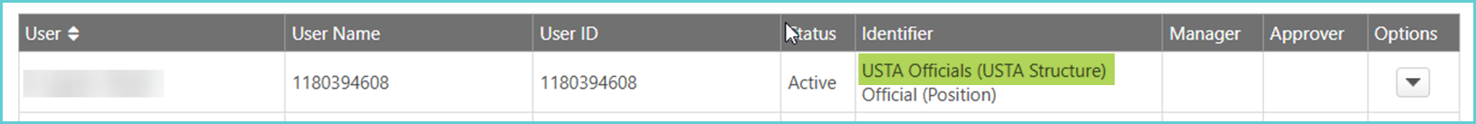 Accounts for USTA Officiating Development Hub users will have 'USTA Officials' under 'Identifier'. Please see the user type information below and the example in the below screenshot.