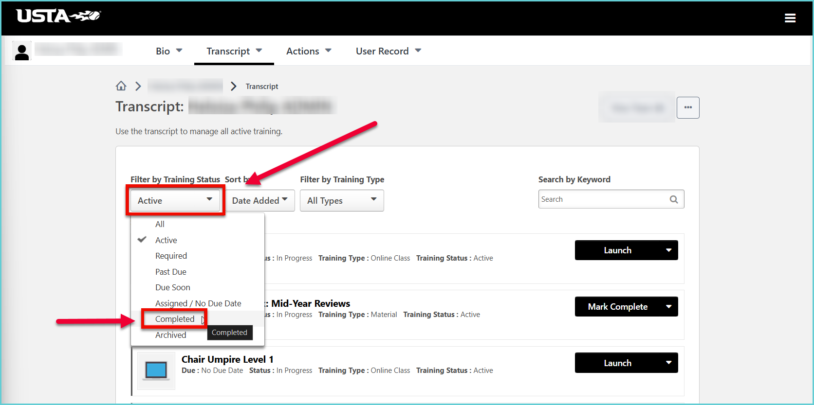 2. On your transcript page, click the 'Active' filter button, then select 'Completed'. A list of your completed courses will appear.