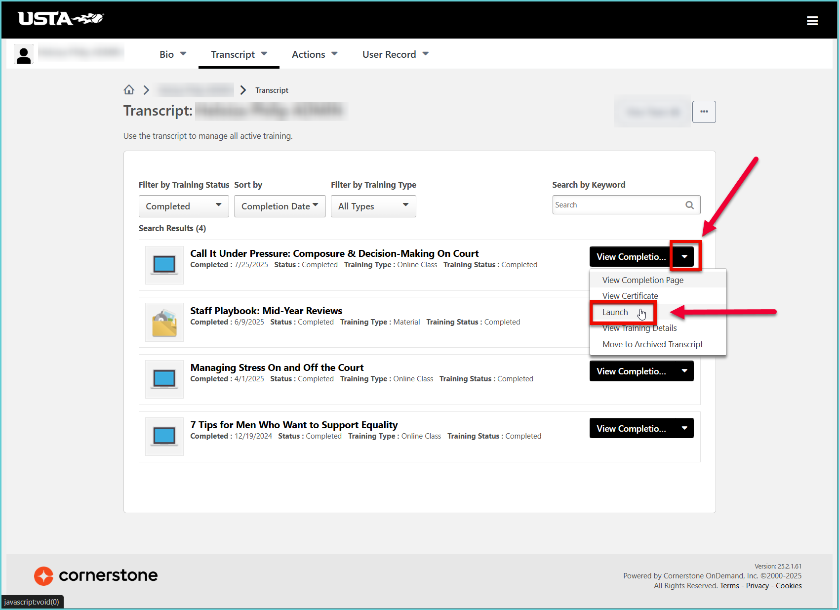 3. Locate the course you would like to launch, then click the down-facing arrow next to the 'View Completion' button. From the drop-down options, select 'Launch'.