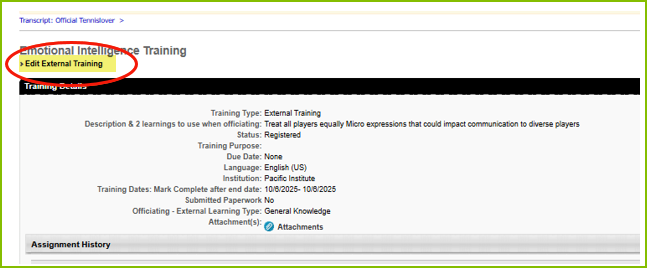 4. On the Training Details page, click "Edit External Training" underneath the title of your request.