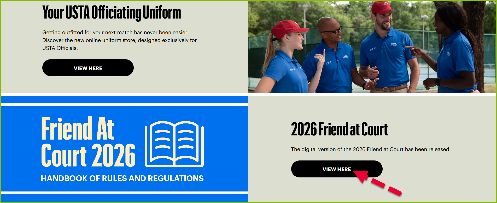 Kindly note that to locate the 2026 Friend at Court, you will need to scroll down to the bottom of your USTA Officiating Development home page, as shown below.